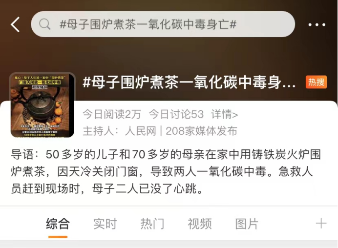 前不久,江苏扬中,50多岁的儿子和70多岁的母亲在家中用铸铁炭火炉围炉煮茶,因天冷关闭门窗,导致一氧化碳中毒身亡。无独有偶,再早几日,浙江宁波的一对夫妻围炉煮茶、烧烤至深夜,在未熄灭炭火的情况下直接就寝,直到次日才被朋友发现一氧化碳中毒。安全漏洞成为萦绕在围炉煮茶头顶的阴云。