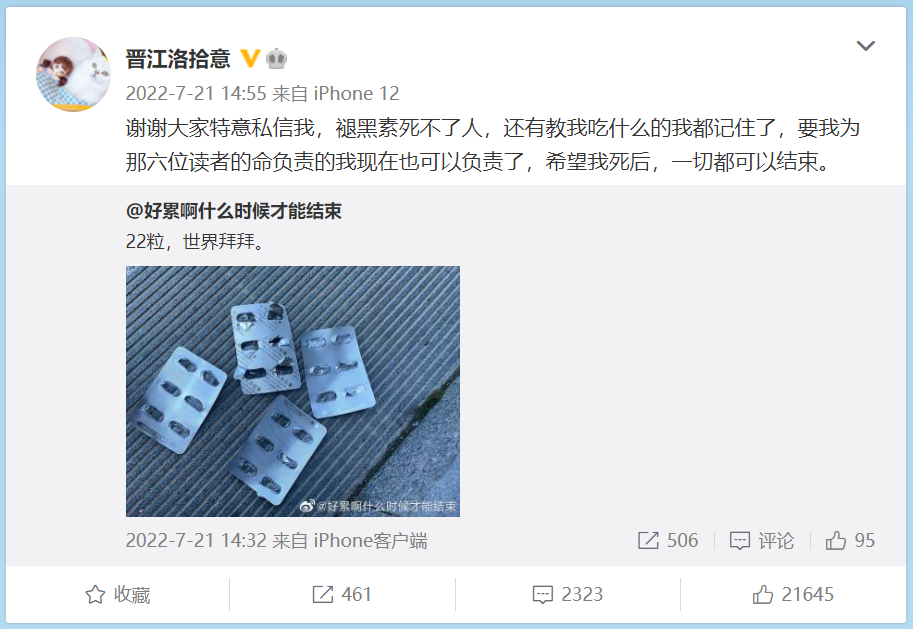 而洛拾意看到自己精心创作的小说,被大量负面恶意信息占据时,精神崩溃,发微博称“我也累了,就这样解脱吧”,服用两瓶褪黑素轻生,所幸朋友发现及时,送往医院抢救,于12日凌晨三点脱离危险。