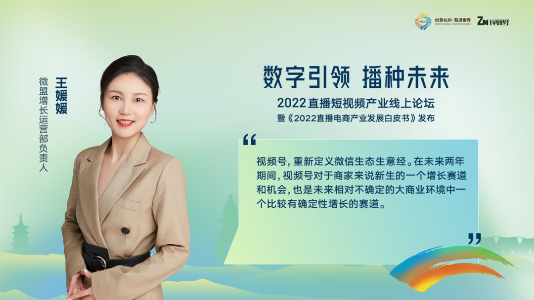 第六位分享嘉宾是微盟增长运营负责人王媛媛,她带来了视频号的相关内容,也迎合此次直播短视频产业线上论坛“数字引领·播种未来”的主题。她提出,视频号,重新定义微信生态生意经。