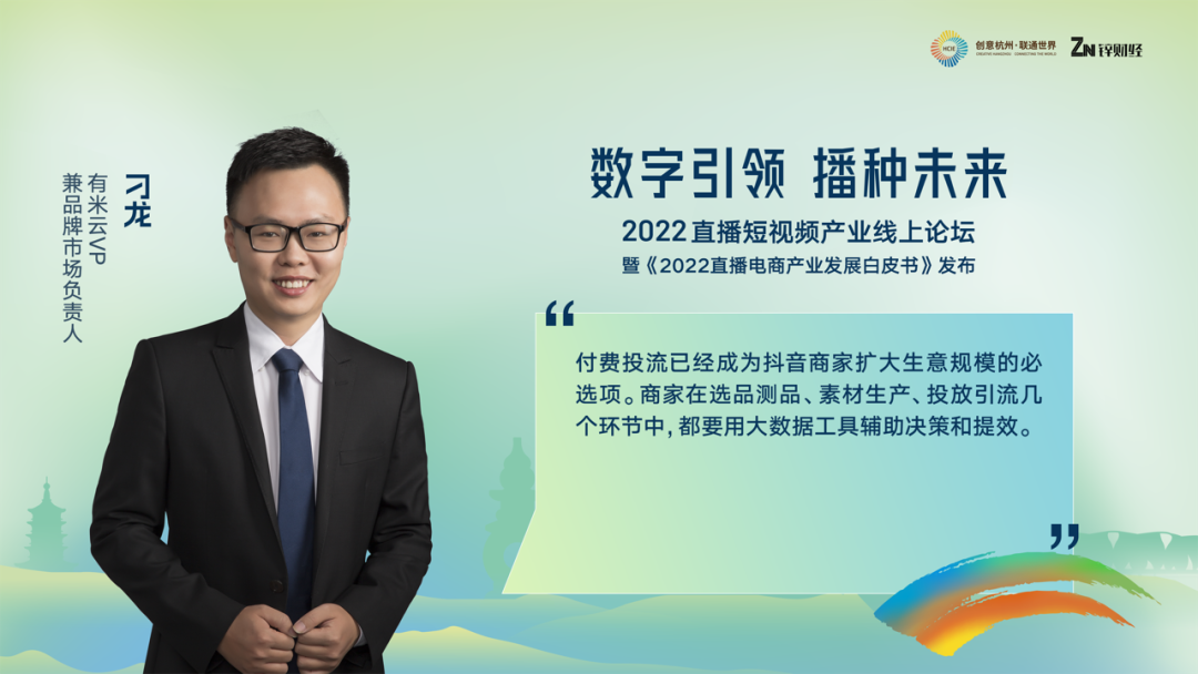 第七位分享嘉宾是有米云VP兼品牌市场负责人刁龙,他向大家分享数字生意时代,数据驱动短视频直播电商的增长飞轮。