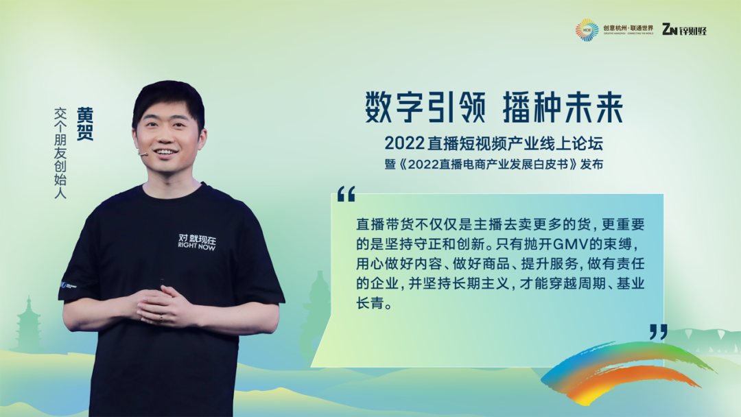 参与分享的嘉宾有交个朋友的创始人黄贺,他带来了交个朋友成立以来的一些经验与故事。在他看来,直播带货不仅仅是主播去卖更多货,更重要的是坚持守正和创新。