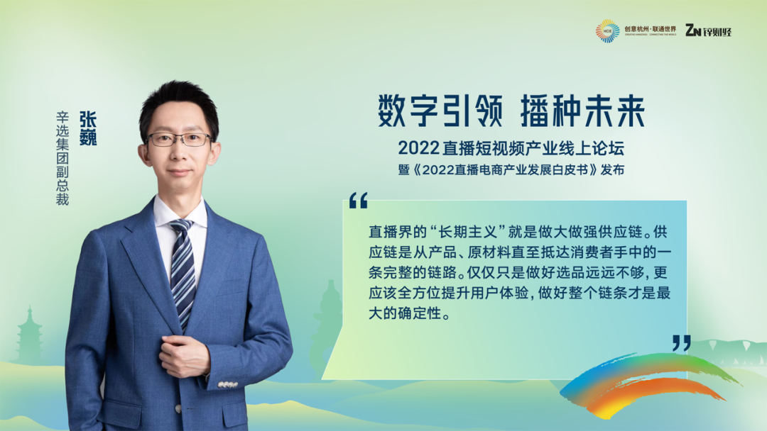 紧接着分享的嘉宾是辛选集团副总裁张巍,为大家深度解读了辛选集团作为直播电商公司中的佼佼者,是如何通过强大供应链的掌控,来应对直播市场变革。张巍表示,直播界的“长期主义”就是做大做强供应链。