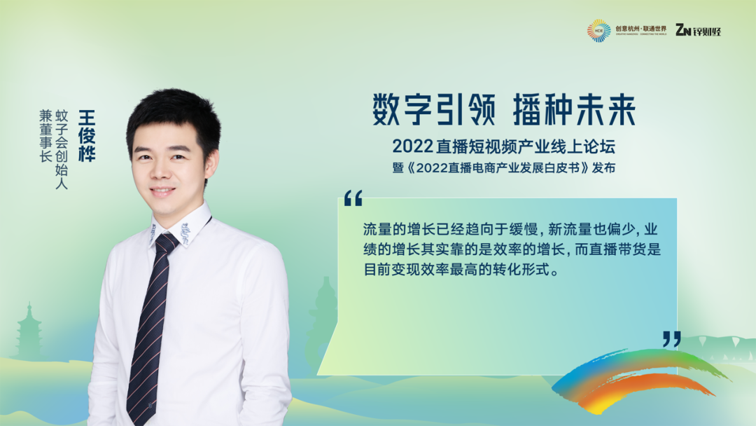 面向未来,潘越飞总结了直播电商的六大未来趋势。首先,直播电商成为标配。第二,企业自播成为常态。第三,随着电商直播的成熟,越来越多的行业开始和直播电商合作,直播电商开始更加趋向于多元化发展。第四,规范化成为了共识。第五,跨境电商成为新的增长点。第六,直播短视频行业的人才需求一直在上涨,人才成杭州核心竞争力。