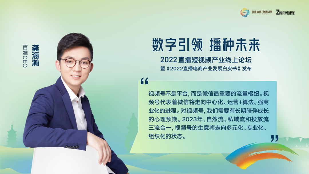 最后一位嘉宾是百准CEO龚海瀚,他分享的主题是迎接视频号的多元增长时代。在过去一年里,百准作为一家视频号服务机构,对于微信视频号的产品侧、生态侧、运营侧的演变与升级,形成了一些思考和观察。