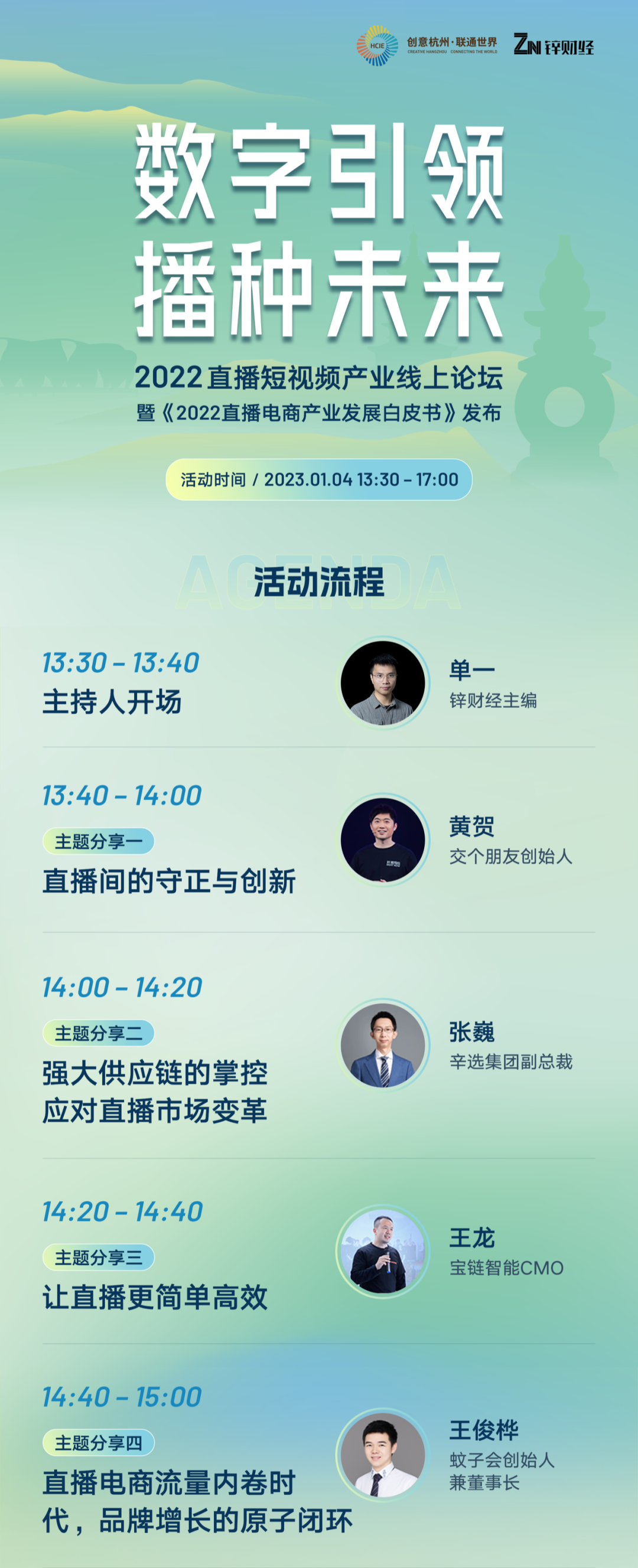 1月4日(周二)下午13:30,由锌财经和杭州文博会联合主办的“数字引领 · 播种未来”2022直播短视频产业线上论坛重磅来袭。本届文博会精耕“思想的文博会”品牌,打破时空局限,联结更多观众,给杭州文化产业带来新气象。
