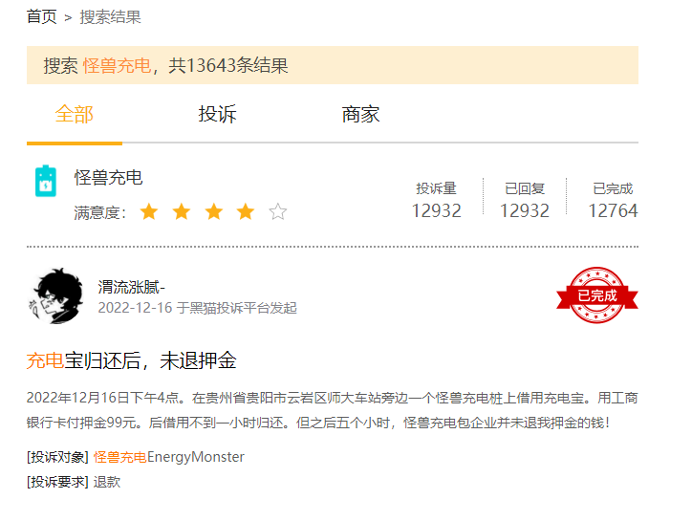 一位代理商在黑猫投诉平台表示,此前怪兽充电做活动,满100台设备赠送75台设备,付款之后却收到了100台翻新设备,赠送的75台设备也是旧设备、坏设备。该投诉用户在多次联系怪兽充电后,均未得到妥善处理。