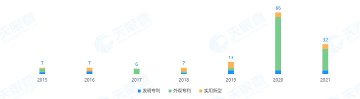 据天眼查显示,蕉下在近两年开始加大了专利申请的动作,可以发现大多数还是集中在外观专利方面。