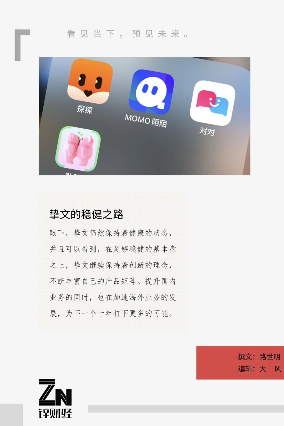 目前在业务层面,除了陌陌、探探之外,挚文在影业、文化、金融投资、创新产品都有更多尝试与探索,这也让公司的生态愈发丰富。