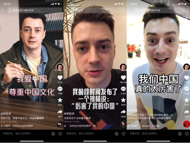 早期“正常”的视频并未给伏拉夫带来流量,直到他发现“我爱中国”的流量密码后,他开始转变自己的视频风格,不断复制爆款,爱中国的声音越发响亮,表情越发夸张。