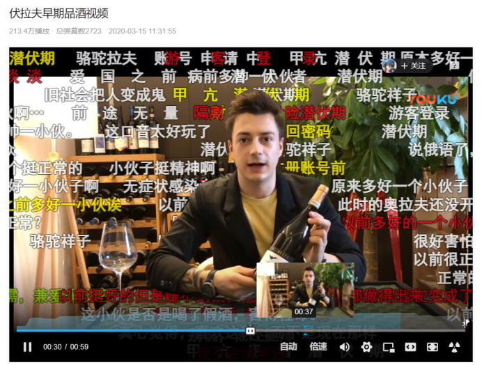 事实上,伏拉夫并非一直如此。在B站上,一个名为“伏拉夫早期品酒视频”的1分钟短视频达到213万播放量,4.1万点赞。在那个视频里,伏拉夫举止正常地介绍红酒,与现在“甲亢式爱中国”的形象相差甚远。网友考古围观后,略带讽刺地评论道:“原来他不瞪眼也能说话。”