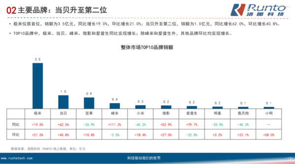 据洛图科技(RUNTO)发布的2022年1月国内投影仪市场报告,当贝的销额成功以微弱优势超越了坚果,仅排在极米之后。