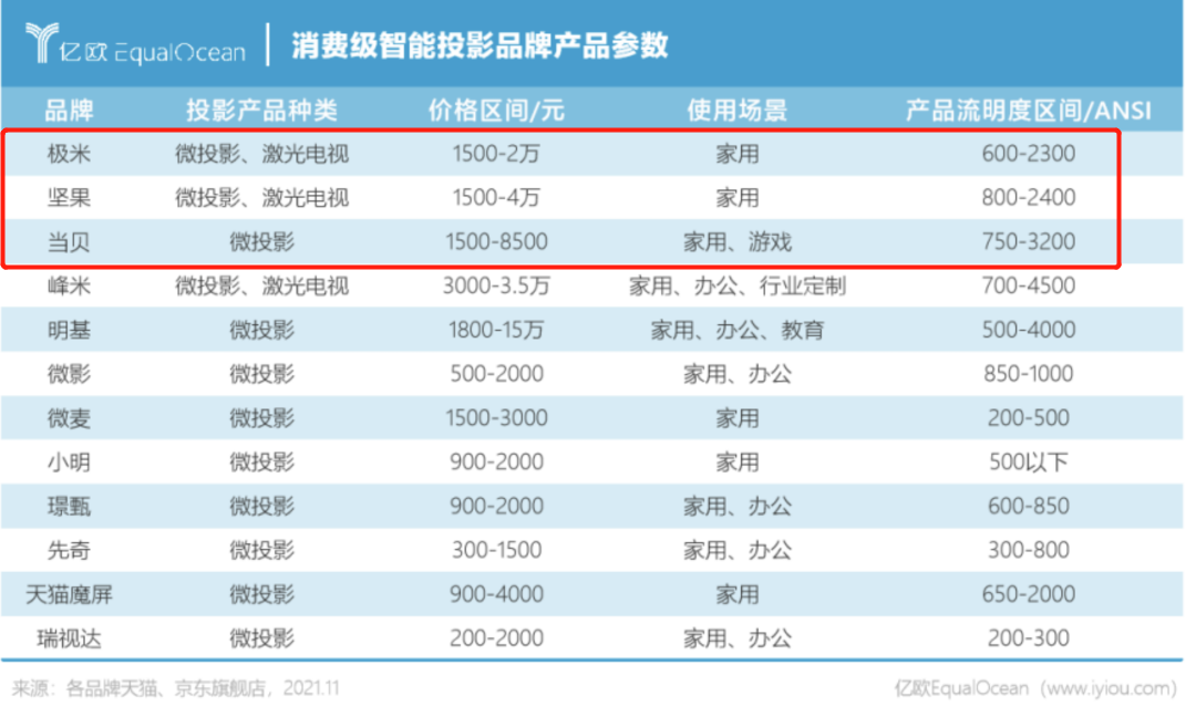 对于品类定位已经被前驱者推动得趋向成熟的市场,当贝选择的打法是性价比。据市面上知名产品的参数对比显示,在前三品牌中当贝的价格区间最低,而产品流明度区间则是最高。
