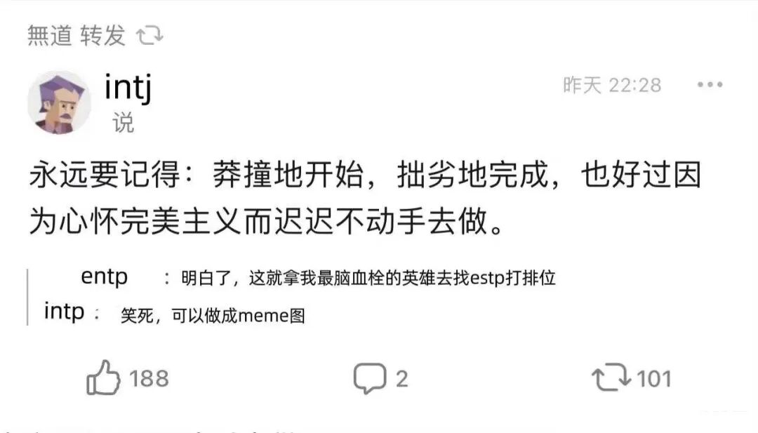 把16种性格特征与梗图行为对应起来,将本来复杂的性格解析简化成“哪类人会做哪类事”,用几个简单场景和对话便能形象生动描述一个人的行为特点。其次,因为Meme图本身具有极高的二创性,可供网友们自由发挥创作,加上图片极易传播,迅速侵袭了各大社交平台。
