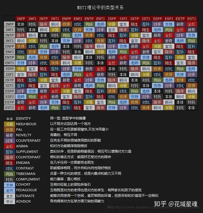 “infp最适合和谁做朋友?”“entj,比较适合跟entp在一起。”在MBTI理论下,交友、情感都变得“简单有效”了。这与当年的星座如出一辙,夸大了其对人际交往的辅助作用。像是星座之间的配对指数,“白羊女与狮子男天生一对”,基本属于换汤不换药。