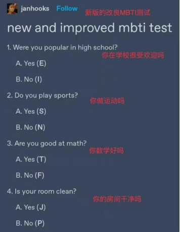 关于这一点,星座可谓是MBTI的“前辈”,输入出生日期即可获取对应结果。因此,要点燃网友们热情的第一把火,便是简化。于是,“改良简易版本”的MBTI测试题出现了,仅需四个问题即可得到答案,从学校是否受欢迎、是否爱运动、是否擅长数学、房间是否杂乱,来对照四个字母。