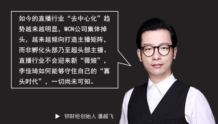 现如今,直播行业“去中心化”趋势越来越明显,MCN公司集体掉头,越来越倾向打造主播矩阵,而非孵化头部乃至超头部主播。而对绝对头部的主播来说,就像薇娅,一旦个人信誉品行出现问题,身后一整个供应链和品牌商家都会摔倒。