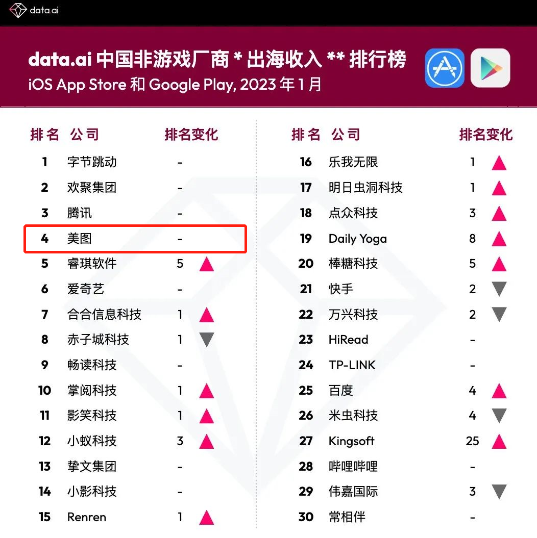 不仅如此,AI绘画功能在日本、美国、巴西等十多个国家和地区引起强烈反映,一度赢得多个国家和地区的App Store免费总榜第一名。来自data.ai的数据显示,AI绘画功能推出后,2023年1月中国非游戏应用出海收入排行,MeituPic(美图秀秀海外版)前进至第18名,而美图公司的整体营收则排名中国公司第4位,前三位是字节跳动、欢聚集团和腾讯。