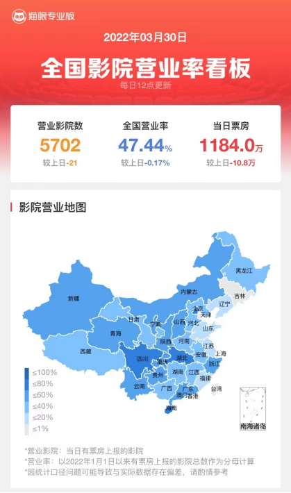 全国疫情反复爆发的严峻形势又给本就困难重重的影院蒙上一层阴云。在《新蝙蝠侠》上映当天,国家电影局发布通知,中高风险地区电影院一律暂不开放,低风险地区电影院需按照属地防疫部署要求进行限流,最高上座率不超过75%。猫眼数据显示,截至3月30日,全国影院的营业率仅为47.44%,较上日又下跌0.17%。