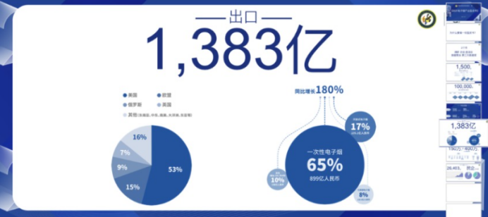 根据《2021电子烟产业蓝皮书》数据,2021年海外电子烟零售市场是国内的25倍,其中国内电子烟预计出口规模达到1383亿元,超五成出口至美国,其次是欧盟国家和俄罗斯。