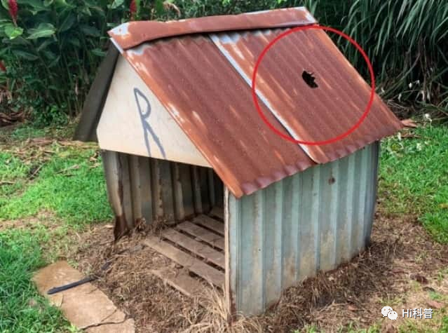 不必担心,洛基平安无事,现在也很健康。狗窝高1.2米左右。当时,德国牧羊犬洛基正在这间狗屋里休息。陨石撞破铁皮屋顶时,他似乎受到了惊吓,但没有受伤,平安无事。坠落下来的陨石大小约为7.6厘米× 7.6厘米,将狗屋的屋顶砸出了18厘米左右的洞。