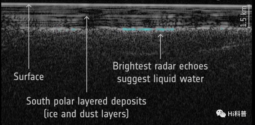 其中也包括水,但更多的是二氧化碳干冰。但是,下面可能还有液体状态的湖。 这个报告是2018年由火星探测器“火星快车”带来的。在冰下面约1.5km的地方,水的雷达反射被确认了。新的研究是利用探索地球南极和加拿大北部、格陵兰岛等冰底湖的技术对这些数据进行分析的。并且在火星南极的冰盖下发现了3个湖。湖泊分布在相当于德国国土面积约五分之一的广阔范围内。