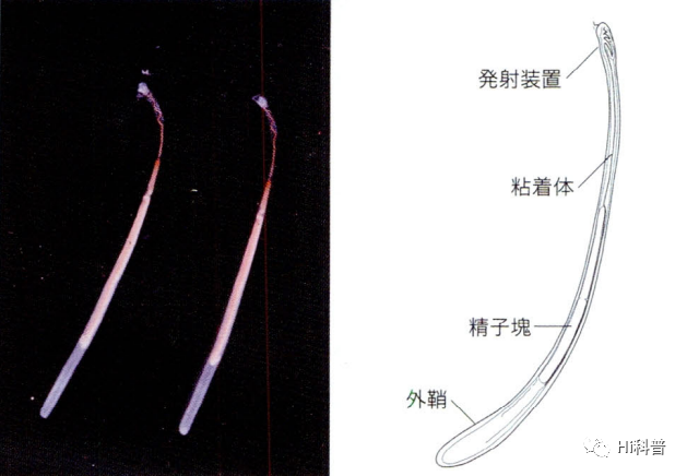 精囊具有多层结构,主要分为精子团、凝聚体和射精管(投射器)。当精囊受到外界刺激时,里面的精子团像导弹一样被弹射出去。精子团的尖端有一个尖锐的鱼钩状倒钩,它会刺入雌性的受精囊并使其受精。这是一个捕捉精细胞爆炸瞬间的视频。如果精细胞被充分加热,它就会停止运作,否则它会像这样在嘴里爆炸。结果,精子会粘在嘴里和舌尖。此外,精囊不是单一的,而是像视频中那样成束存在,因此无数的精子刺入了口腔。