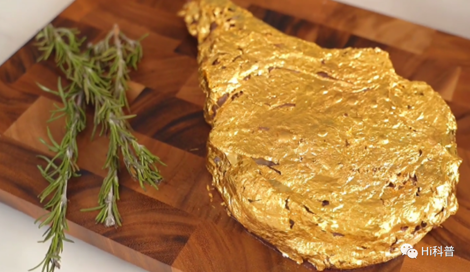 选择好食材后,将牛排用吸油纸将表面的水分吸干。涂抹上橄榄油、海盐、黑胡椒摩擦均匀。土豆切滚动块,放上彩椒、西兰花、水果与橄榄油、黑胡椒、孜然粉、辣椒粉、盐、糖等调料混合搅拌均匀铺上烤盘底部,放进烤箱预热。战斧牛排腌制过后先煎定型,随后与蔬菜水果一块放入烤盘后送入烤箱180度烤15分钟左右。刚出锅的牛排还冒着丝丝热气,趁热在上面铺上一层金箔,金箔使用的都是24K黄金,都是白花花的银子!一块战斧牛排用的金箔成本就得几百元,金灿灿的金箔将整个牛排包裹得特别豪气。黄金能够打造成饰品,能够在多个领域应用。黄金还能吃?难道不会吃了重金属中毒吗?