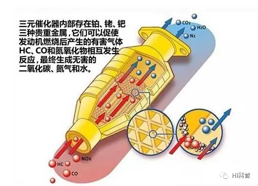 最初运用于催化还原尾气的是金属铂,它能将碳氢化合物和一氧化碳很好的催化为无毒、无色、无害物质。但缺点比较明显,只有在氧气充足的时候,它的性能才能完全体现出来。 为了克服这个缺点,还在要加一些金属钯来配合铂发挥作用。金属钯与铂的作用一样,都是用了催化还原碳氢化合物和一氧化碳。虽然它不需要充分的氧气来发挥作用,但它的缺点是,会与铅汽油发生反应。在发生反应的过程中,含量会逐渐减少。