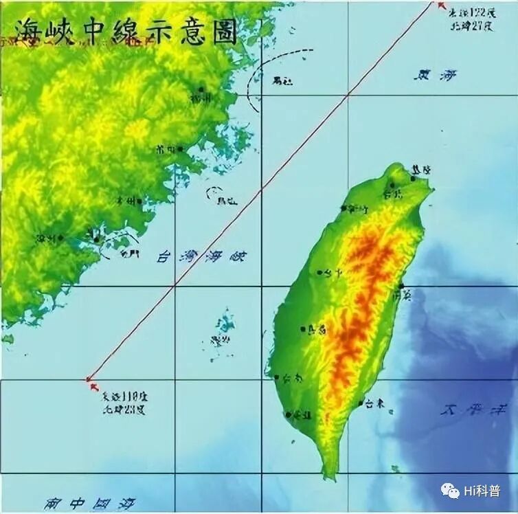 “海峡中线”究竟是什么?所谓的“海峡中线”就是指台湾海峡从海平面一直往空中延伸的、东北-西南走向的中心线。但是这并不是一条被大陆接受的、具有明确定义的标线,仅仅是被台湾和美国承认的“虚伪”分界线。那么这条线究竟是怎么来的呢?其实“海峡中线”是上个世纪50年代两岸分离所遗留下来的历史问题,是由美国主导划定的。1949年,国民党退守台湾,与大陆隔海对峙。美国除了派遣第七舰队协防台湾以外,并于1954年底在华盛顿与国民党当局签订“共同防御条约”,在台湾设立了“美军协防台湾司令部”。1958年,海峡两岸为了争夺大陆沿海地区的制空权,爆发了一系列的空战。