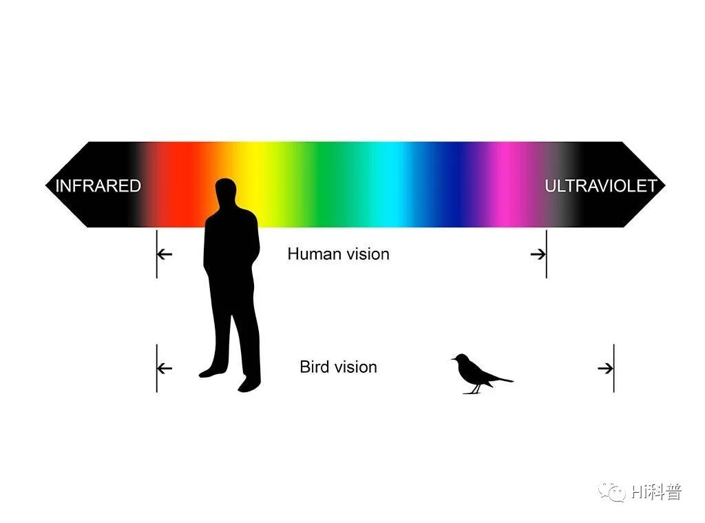 人类的眼睛里,就有感知红、绿、蓝三种颜色的视锥细胞,很多哺乳动物只有两种,而日行性鸟类却基本都拥有四种视锥细胞,多出来的一种就能感知到紫外线。
