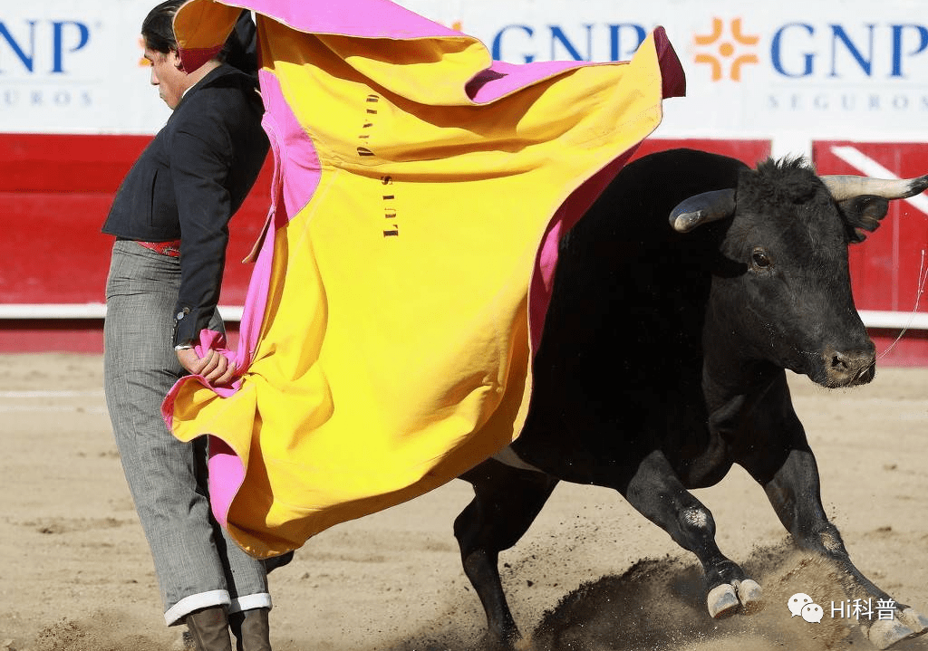 牛看到红色的东西会非常暴躁,所以斗牛士总要扯着红布在牛眼前晃动。为了不刺激到牛,穿了红衣服的人在村里都要躲着牛走。