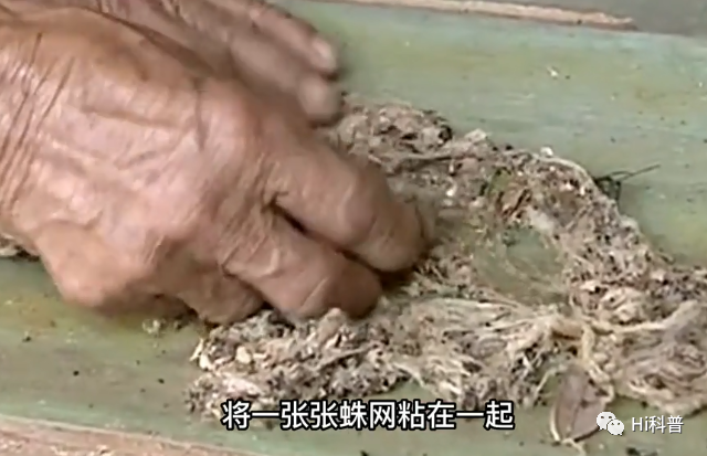 清理好的蜘蛛网黏在一起,下面垫一块木板,上面放上木块一压,一块结实的“布料”就完成了。但蜘蛛网实在太过细小,想要制作一件成衣,至少需要找300张蜘蛛网!