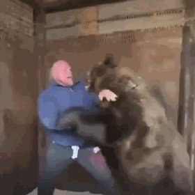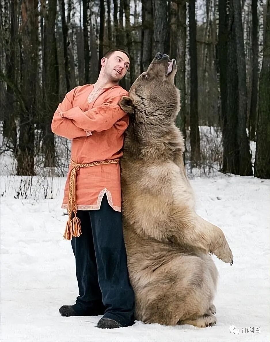 俄罗斯人和棕熊,这还是从小家养的熊,并且只是在玩闹
