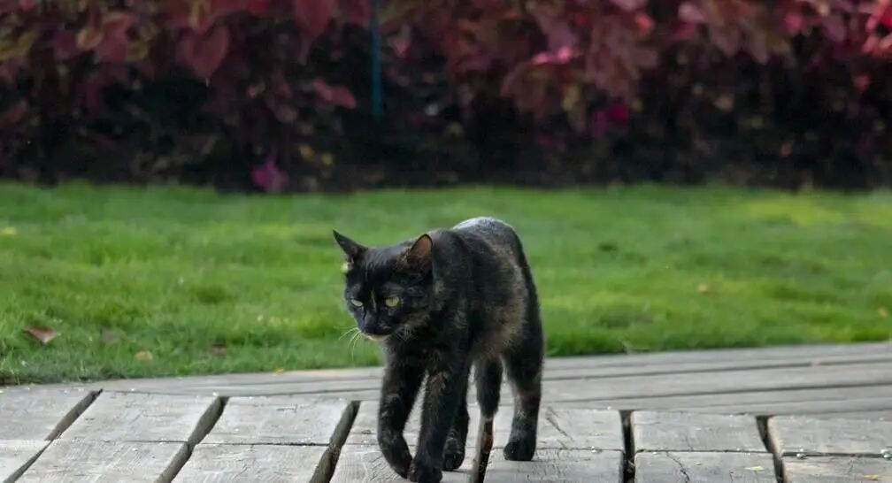 这是在绿堤蝴蝶展附近的一只小黑猫,眼睛饿得都迷离了,迈着摇晃的步子,一脸的疲态。显而易见这是捕食失败,无精打采回来的样子,它已经不顾人类在看它了,只想赶紧找到点吃的,一点儿也没有警醒的感觉了。