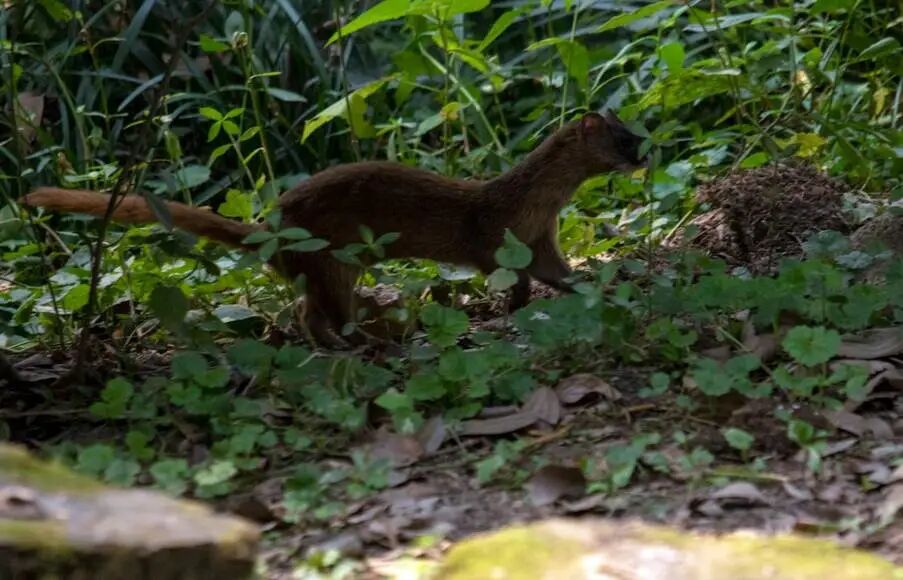 这只流浪猫不远处就有一只黄鼠狼,一窜一窜的走着,丝毫也不理会这只小黑猫,按正常理解,以猫的个性,凡是带鼠字的都归它管嘛,这应该是它的食物,应该好好上前挑战一番的,但我们看不到这场大战,因为黑猫已然头重脚轻,摇摇晃晃了。