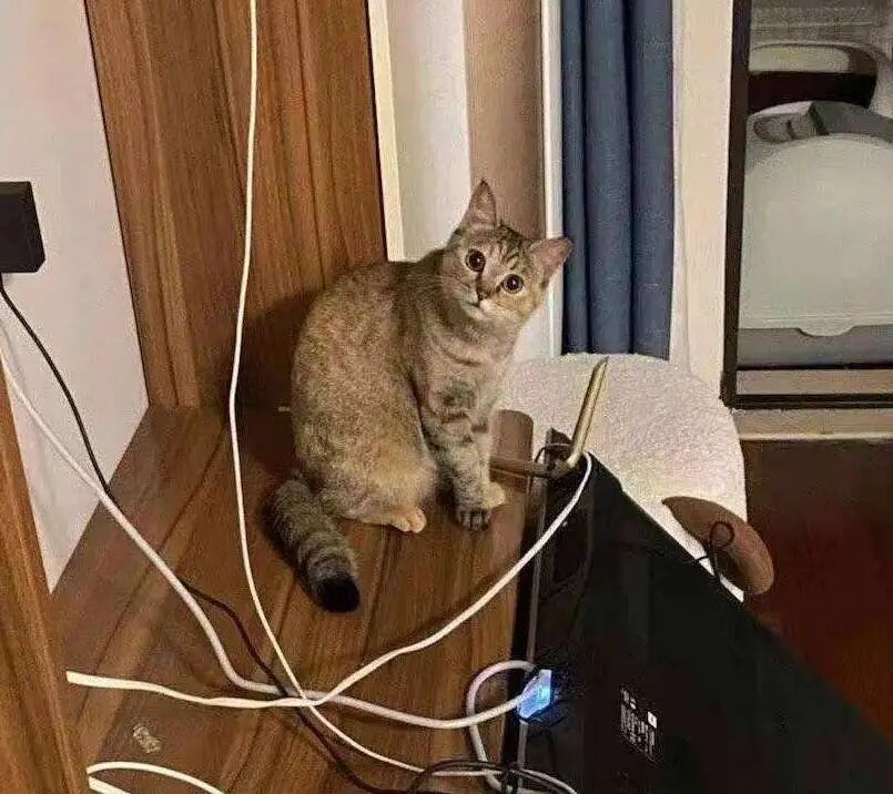 更让我崩溃的是,我的电脑网线、鼠标线、键盘线,通通都被这只猫咪咬断了,所以回家想要打游戏,那是不可能的。