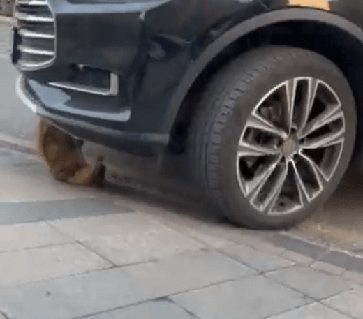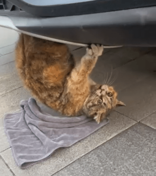 车主下车后发现,猫卡在了底盘里。他一时不知所措。李先生和朋友从自己的车上拿了一条毛巾,垫在猫的身下。敢贸然脱下,生怕对他造成二次伤害。”