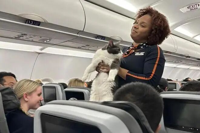 一位专栏作家搭乘捷蓝航空从南加州安大略到纽约甘迺迪机场时,机上女空服员突然抱出一只“庞然大物”,她吃力地举起它四处寻找饲主,但因为这只猫在体重上“太有实力”,她不禁脱口说出真心话“真的好重”,让现场乘客都忍不住笑了出来。