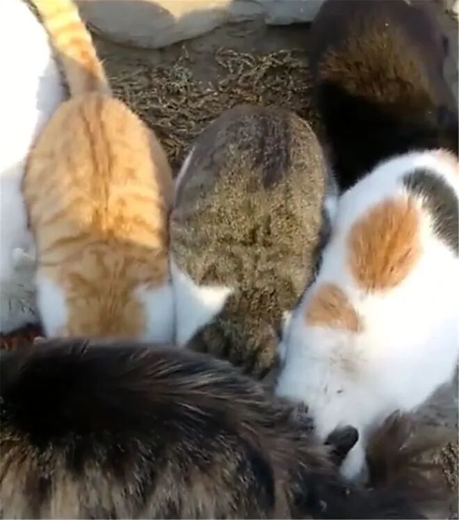 这些流浪猫几乎都是没人要的田园猫串串,毛色也是五彩斑斓,不光有橘猫、狸花猫、白猫、黑猫,还有一些花里胡哨的猫。