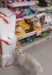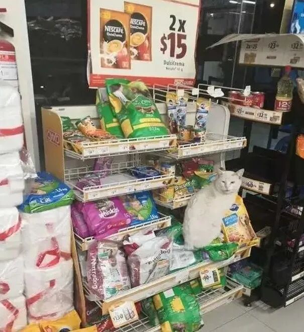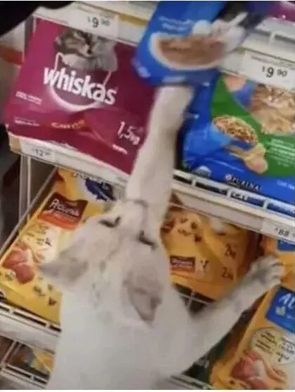 猫咪一边走还人性化的一边回头(不是说建国后动物不能成精了吗?忘了,这是只外国猫,不归中国管),确认这姑娘跟着它走进超市。接着它径直走到一个角落,她一看瞬间明白:一个放满猫粮的货柜。