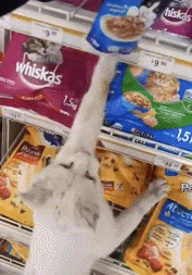 猫咪还站起来,伸手想要拿上面一个蓝色袋子,已经指定好要吃哪款食物:对,就是这个,给我买这个,我想吃很久了!这猫都不能说有灵性了,都快成精了!