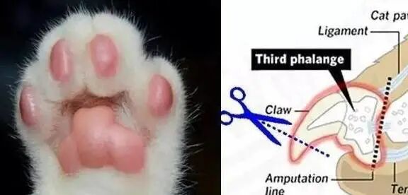 这种手术就是将猫咪的爪子部位,包括第三趾骨以及周围的肌腱和韧带这些部分切除掉,可以想象这种连骨带肉的切除手术是有多痛苦,而且还是让一只小小身躯的猫咪来承受。
