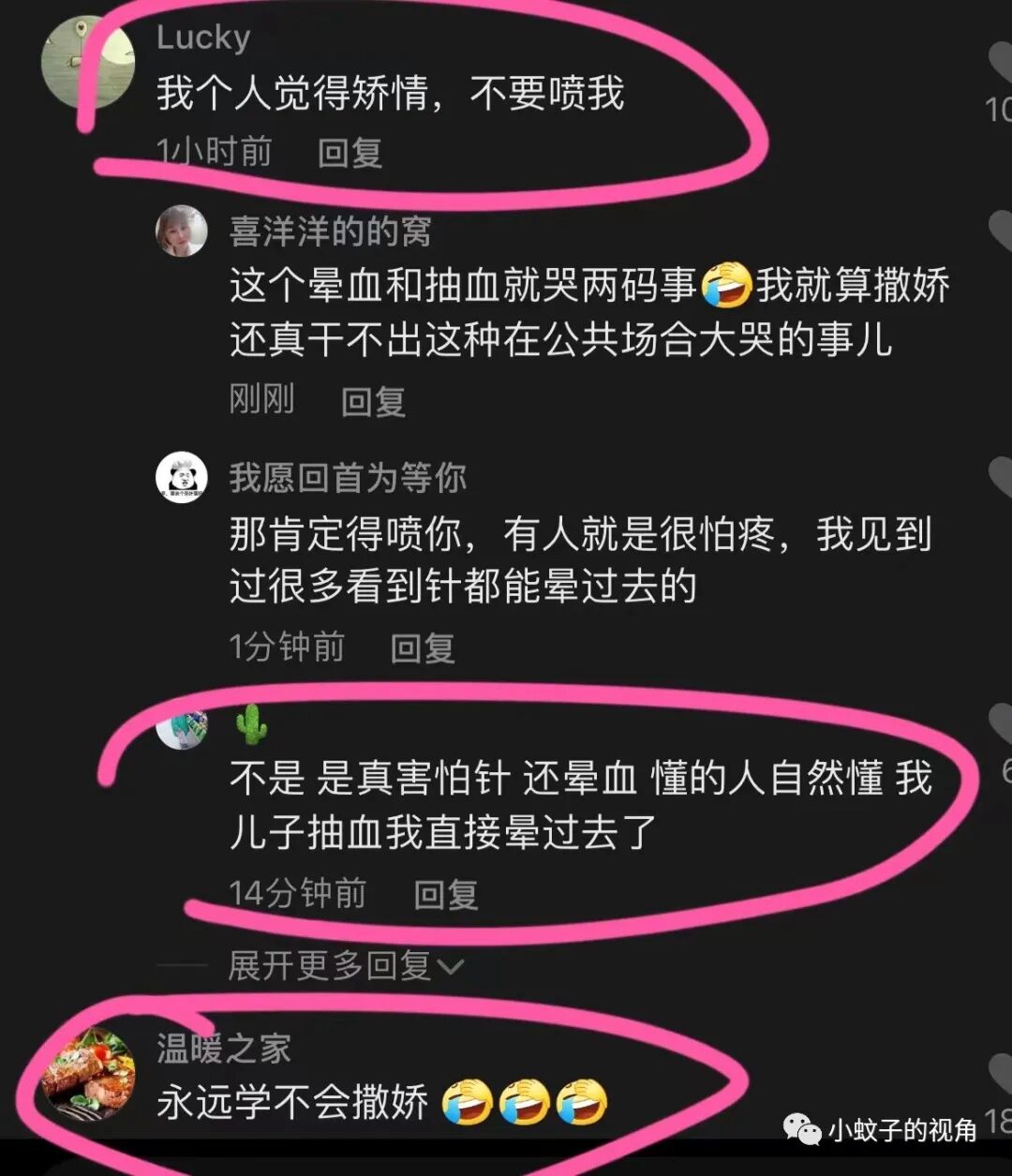 下面的网友纷纷留言发表自己的看法,有人说:这个晕血和抽血就哭是两码事,我就算撒娇还真干不出这种在公共场合大哭的事儿。