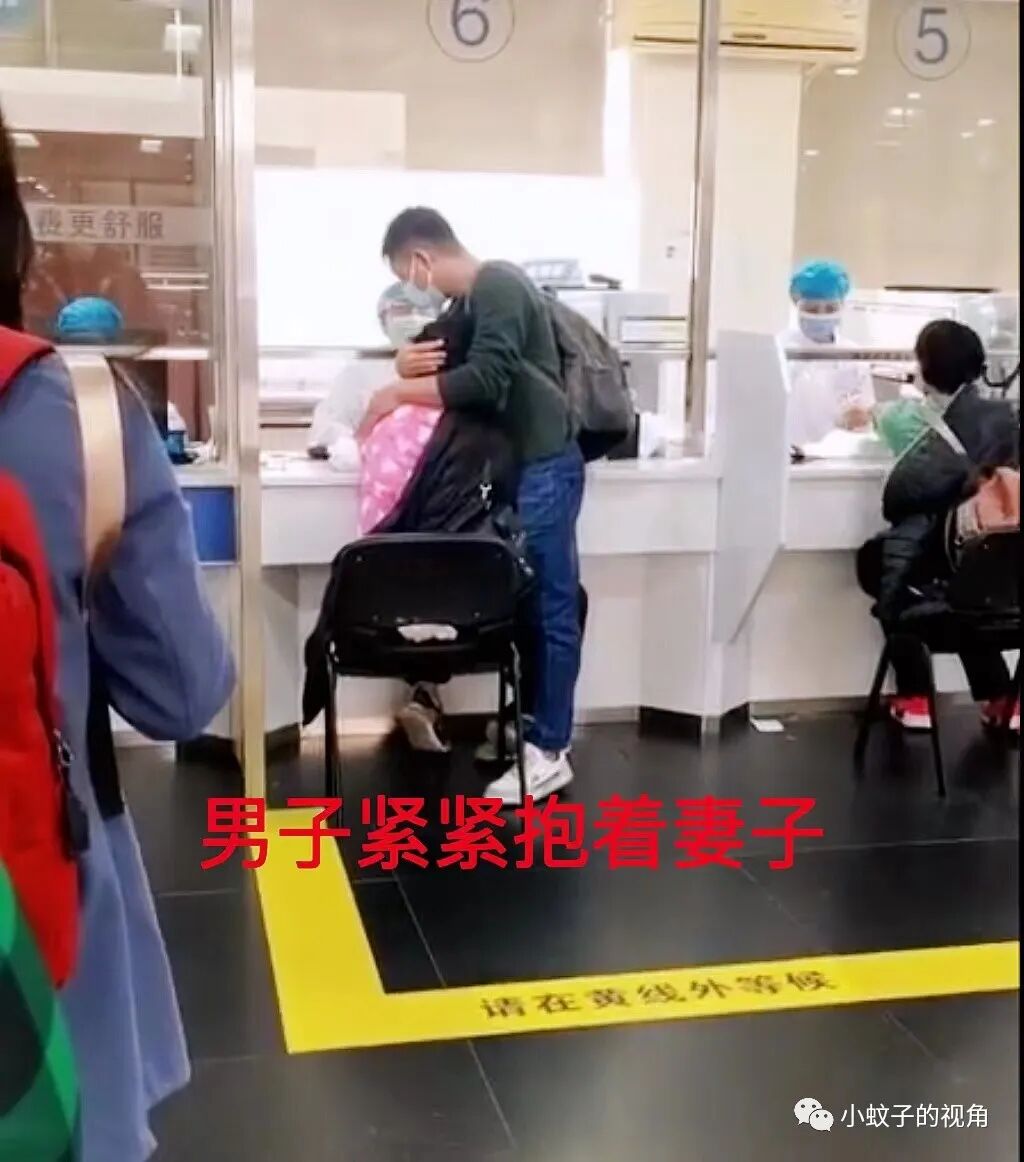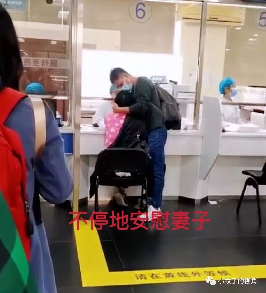 她老公就守在女子的身边,一边用双臂紧紧地抱着女人,一边像安慰孩子似的说着:没事、没事……