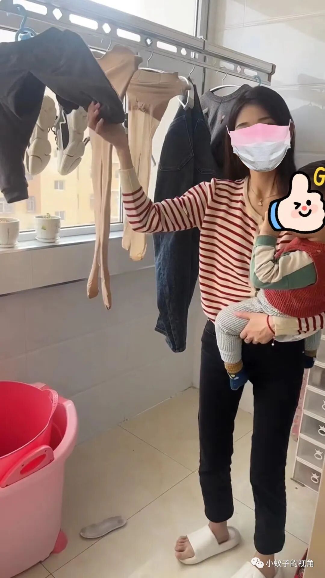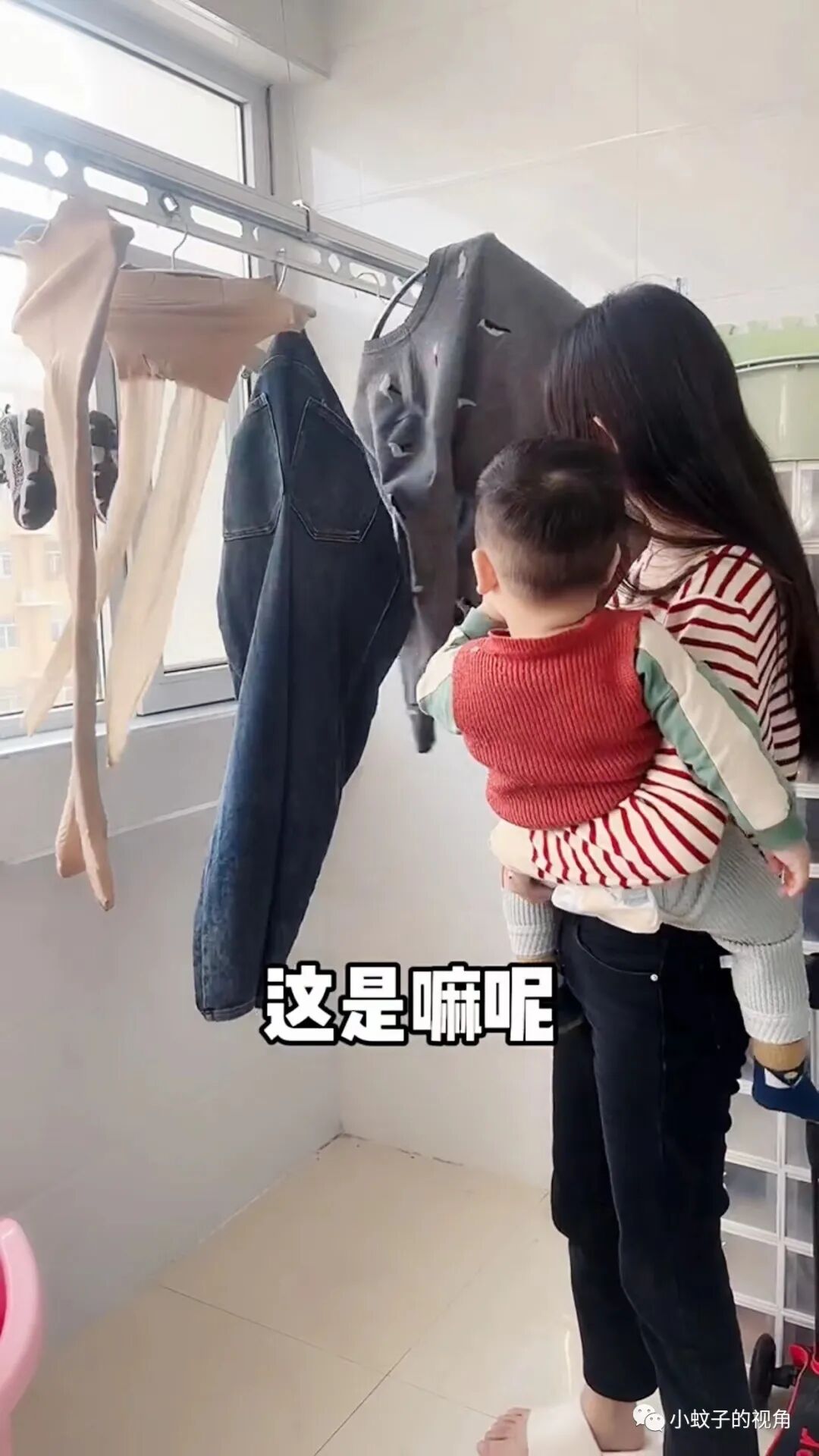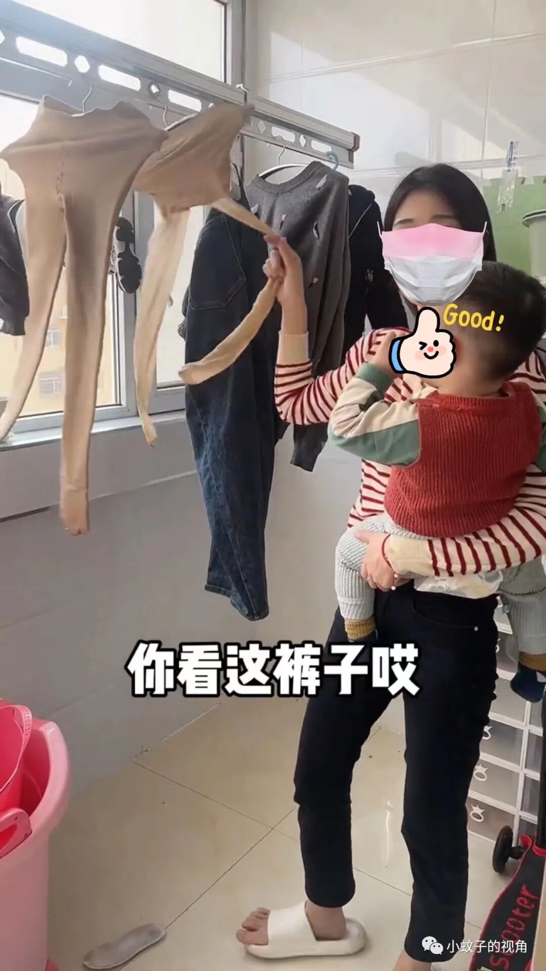 孩子的裤子虽然挂起来了,但是还有一条裤腿蜷在里面呢,也没有伸开。妻子的打底裤用衣架撑的两边鼓鼓囊囊。