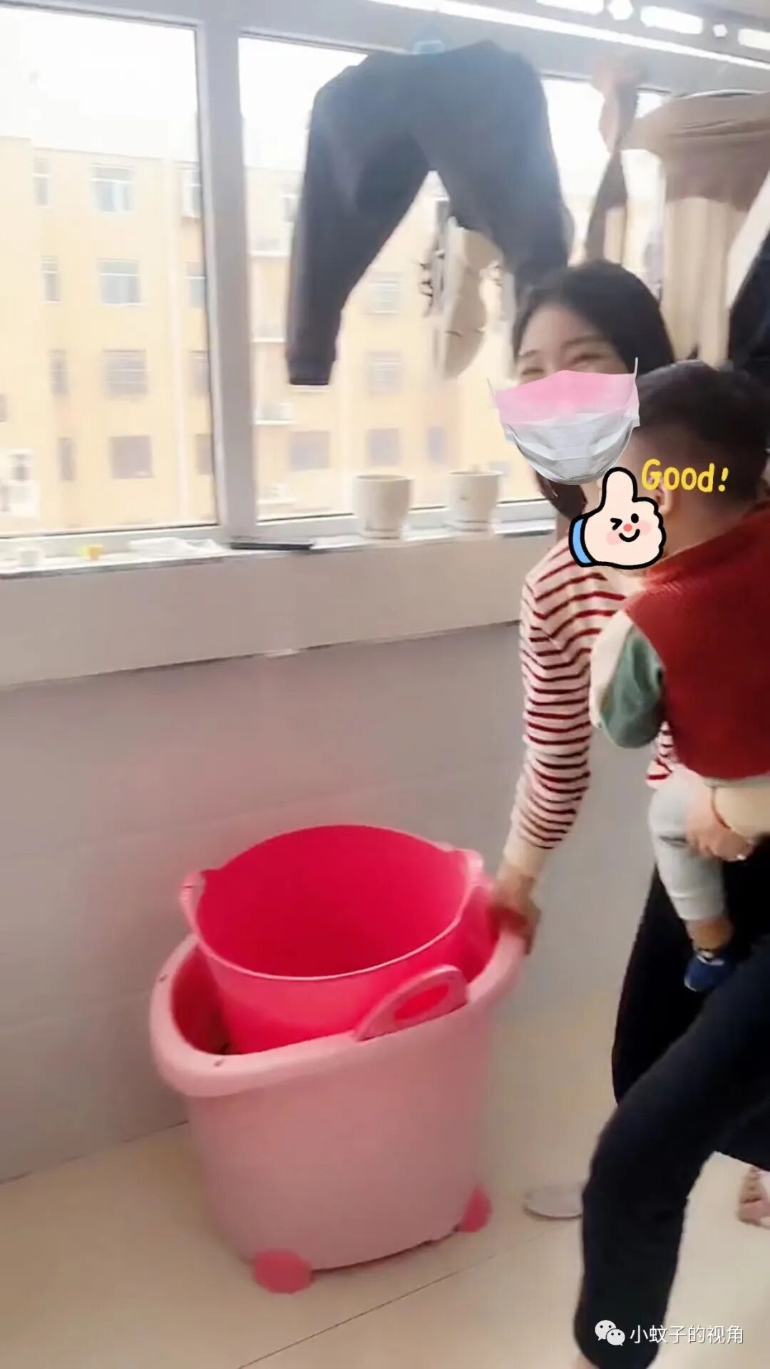 视频中,男子的妻子一只手抱着孩子,一只手扯着阳台上晾晒的衣物,大声喊老公:“你过来,快过来,来看看……”