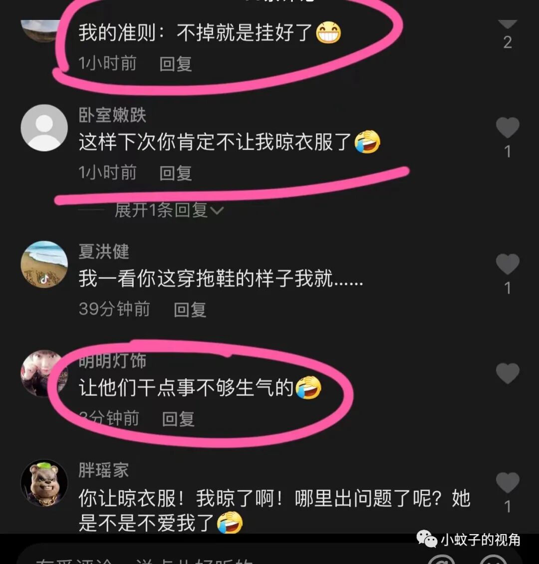 妻子气愤地说:“这都是干嘛呢?你是真不会晾衣服吗?还是假不会啊?你要干就把活干好了,你整一遍,我还得再整一遍,咱出两份力,干嘛呢?”