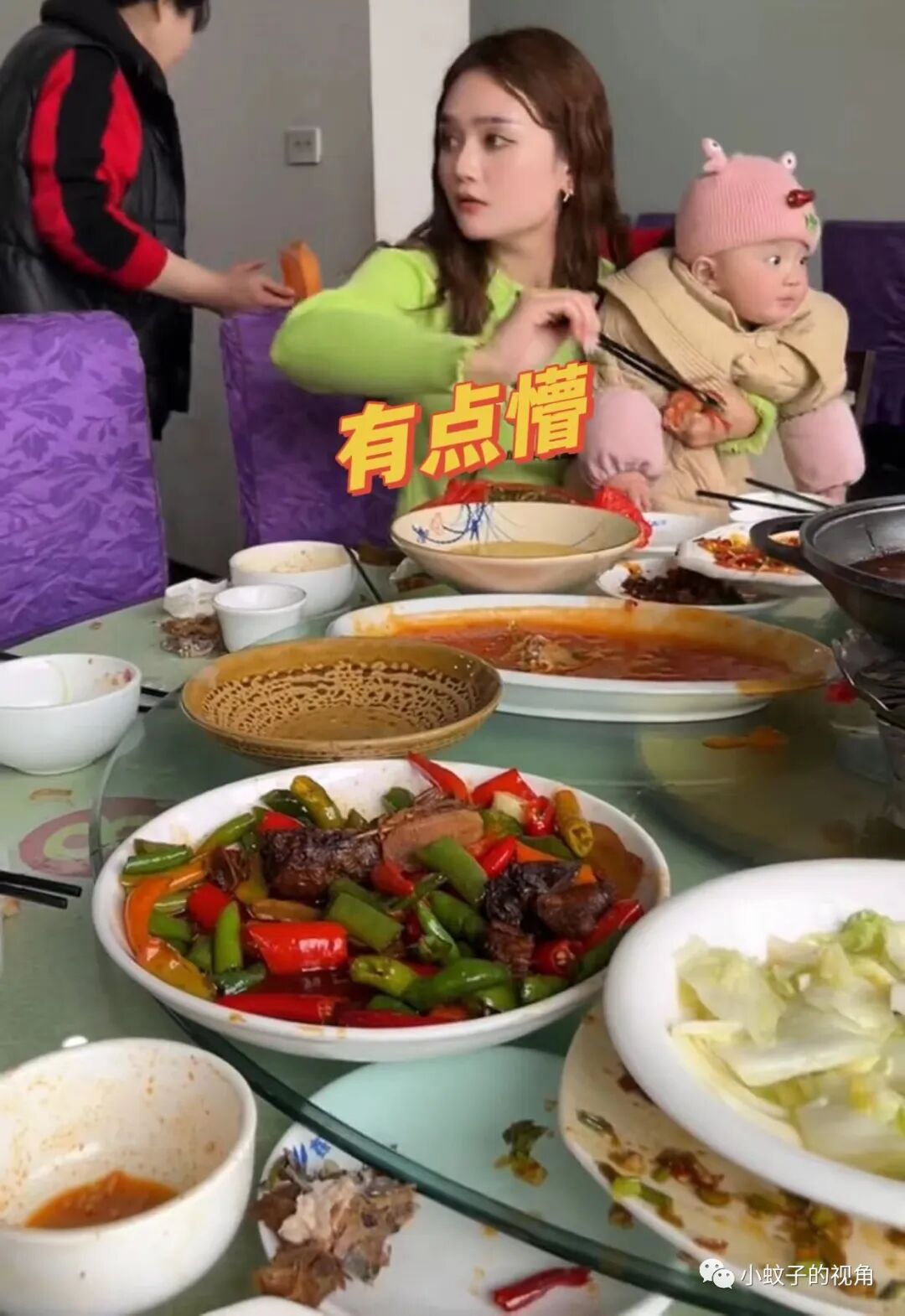 女子看着离开的老公依然一脸懵,他怎么走了?拍摄者看不下去了,替她抱着孩子让她吃完了这顿饭。