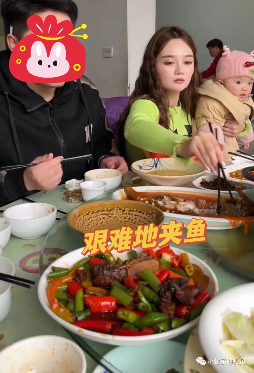 只见她一手抱着孩子,另一只手夹起所剩不多的鱼肉,艰难地将这半条鱼翻过来,反过来后才发现鱼肉已经不多了!