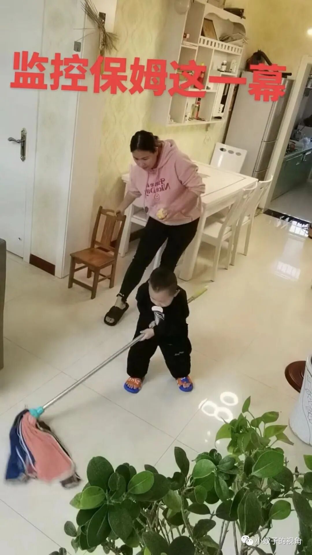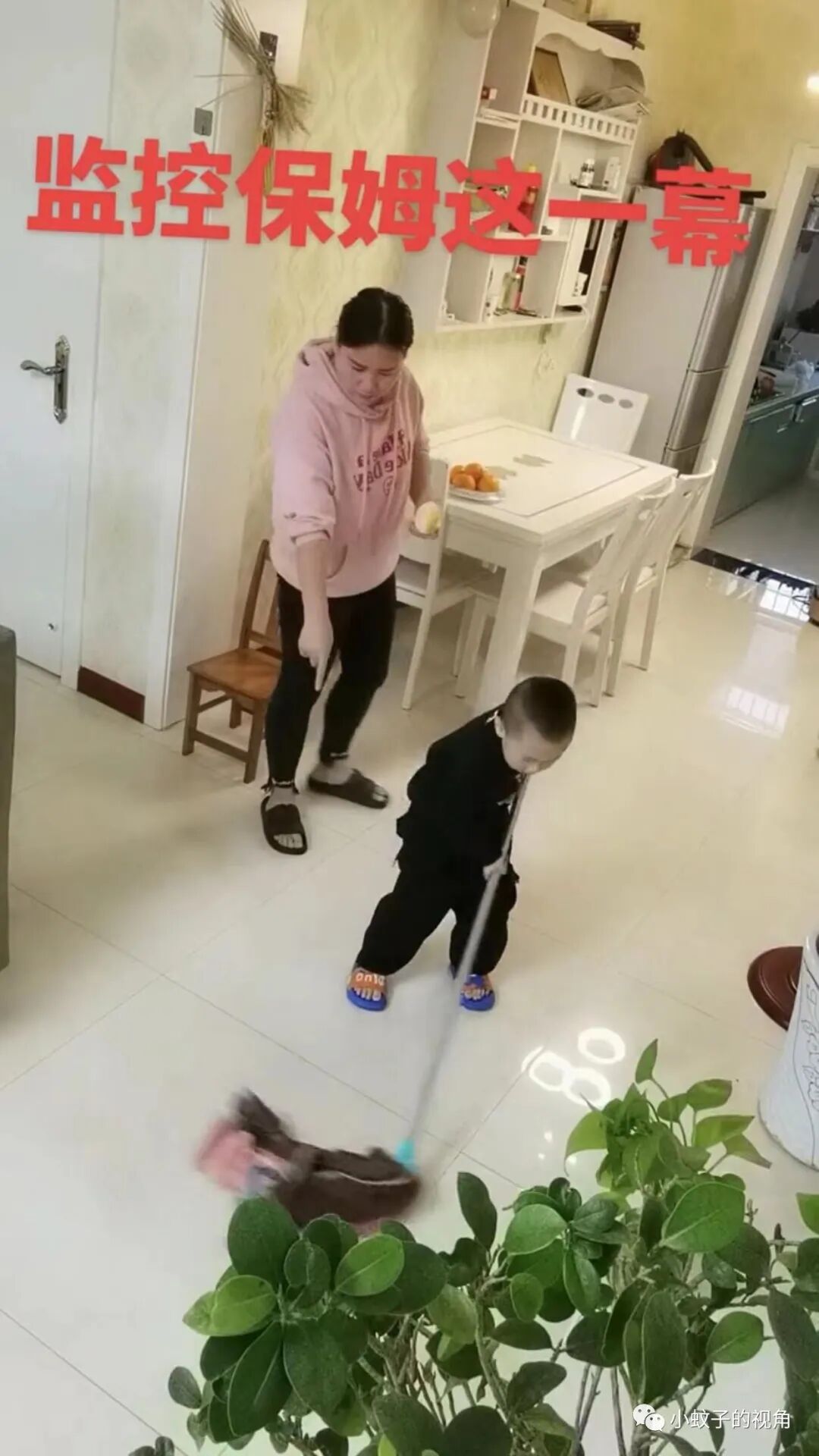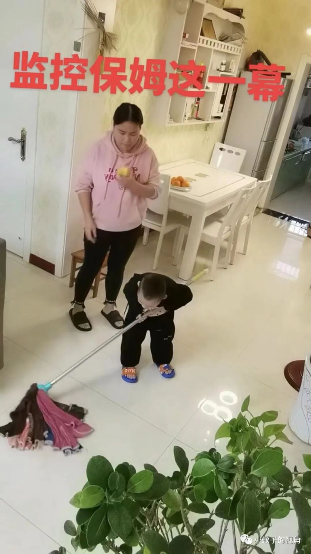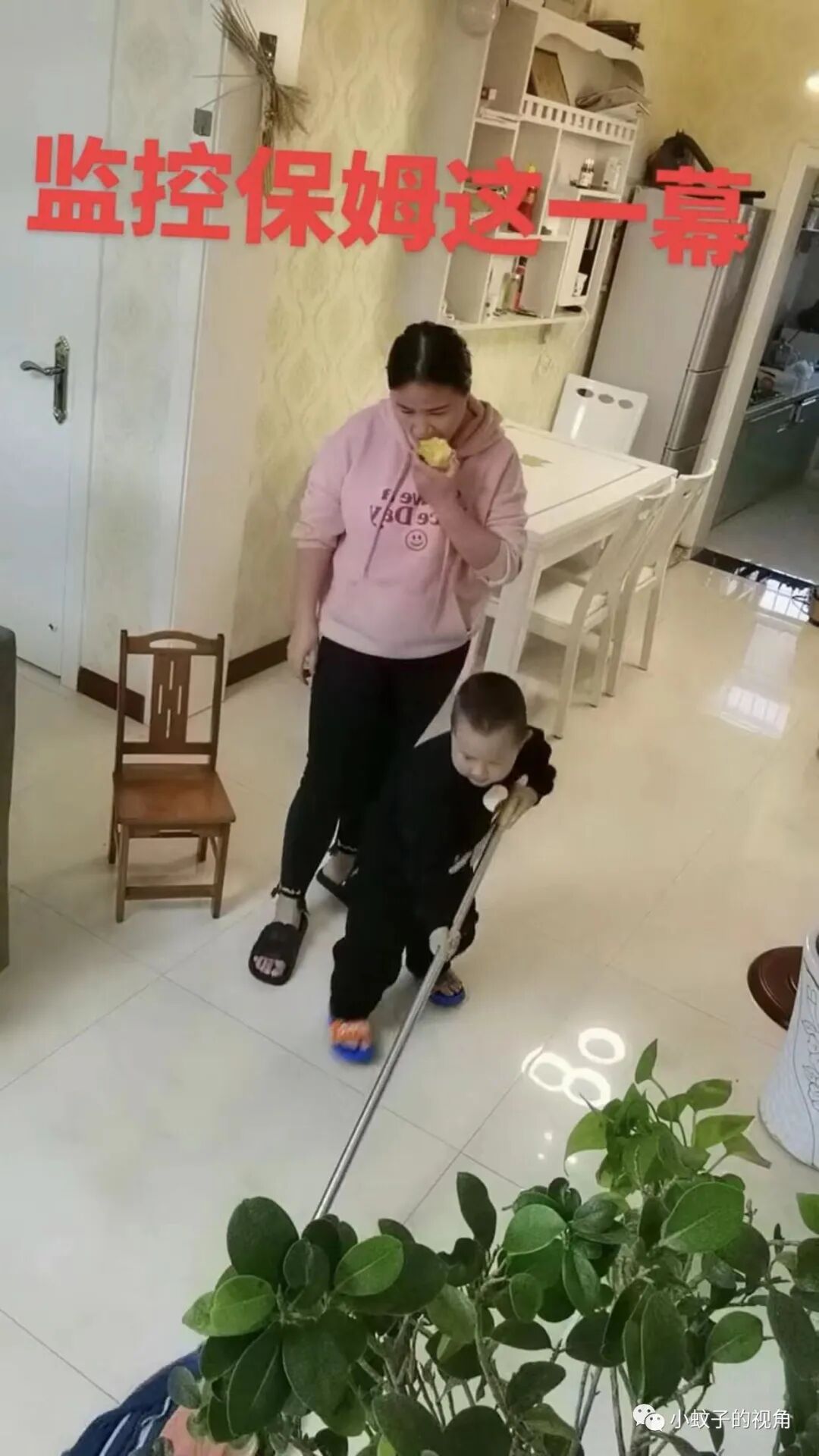 监控中只见孩子抱着大拖把正在拖地,阿姨则站在他身后一边吃东西一边指挥。一会儿告诉孩子这里拖得不好,一会儿告诉孩子那里还没拖干净。